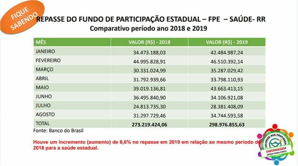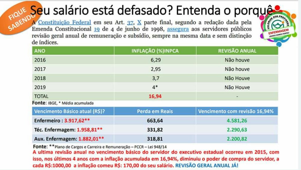 Decisão do STF no dia 25 de setembro, acompanhe na integra pelo endereço eletrônico http://portal.stf.jus.br. A revisão Geral anual é uma pauta e reivindicação das categorias, inclusive a da enfermagem. Os servidores estão desde do ano 2016, solicitando que o ESTADO pague este reajuste, desvalorização é o sentimento que os servidores vem sentindo, sem reajustes com seus salários defasados. Ambas tabelas abaixo tem informações fidedignas da atual situação, e não impede que o reajuste seja efetuado para valorização do servidor, conforme tabela 2 o repasse do FPE aumentou em 2019 mais de 25 MILHÕES.confira!