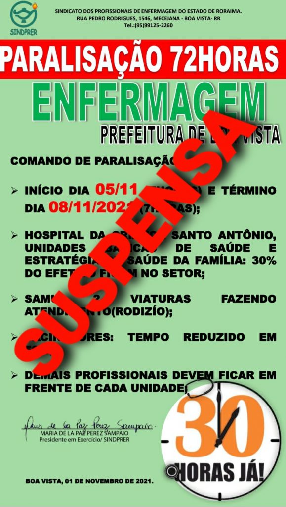 deliberada pela categoria a suspensão da PARALISAÇÃO da Enfermagem. Após acordo com a SMSA e PMBV em reunião com os representantes sindical. Acordado que será feito o envio do PROJETO DE LEI 30horas da enfermagem e a readequação das vagas do concurso. O prazo dado para envio a Câmara dos vereadores é dia 24/11. Caso não cumprimento do acordo haverá GREVE a partir do dia 01/12.